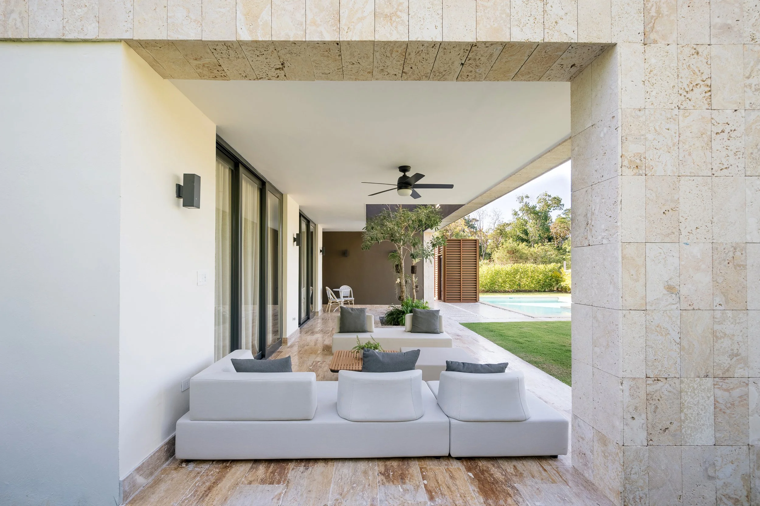 Queremos que nuestras casas reflejen la época en la que vivimos y a su vez el entorno donde se encuentran. Villa coco es un reflejo de esta premisa. Una casa con un volumen contundente que apela a ser vista manteniendo la privacidad de sus usuarios, arraigada al entorno del village de punta cana por su materialidad, y con unos quiebrasoles que juegan con la luz y sombra del sol candente por estar cerca del mar. La casa en su interior se abre completamente hacia el exterior, pero tiene un gran vuelo hacia la terraza para mantener en sombra el área social y poder combatir el calor de la zona. La vegetación se integra al diseño permitiendo que un gran árbol de roble penetre la casa y se vuelva parte de la misma.